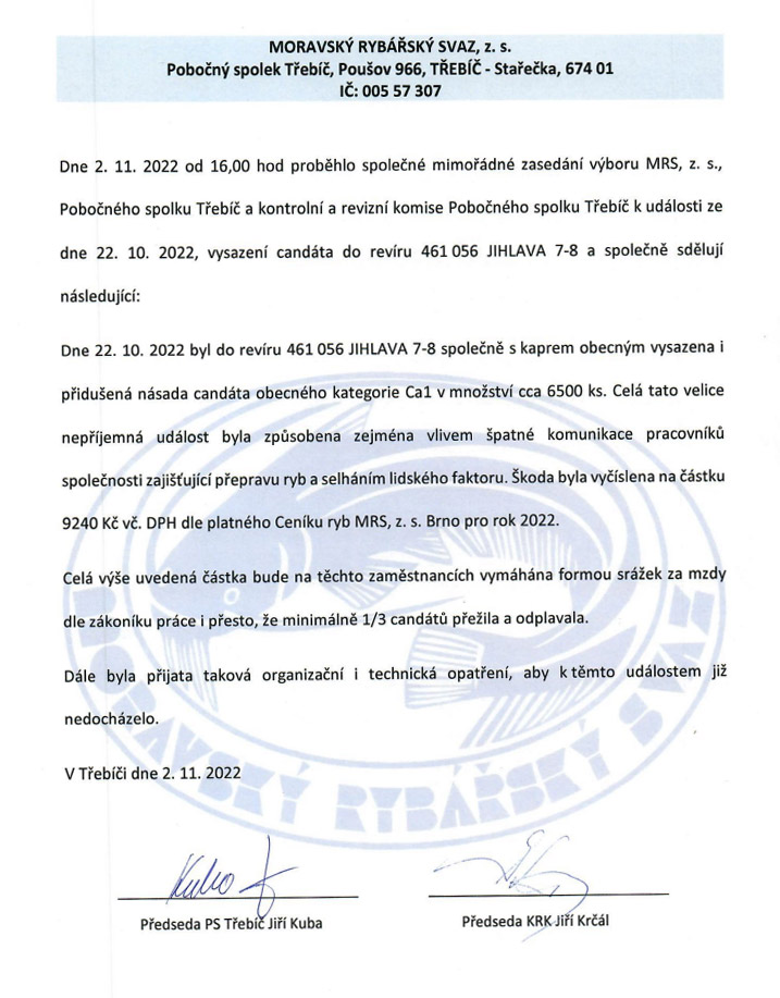 Prohlášení výboru PS a KRK k vysazení candáta do revíru 461 056 JIHLAVA 7-8 dne 22. 10. 2022